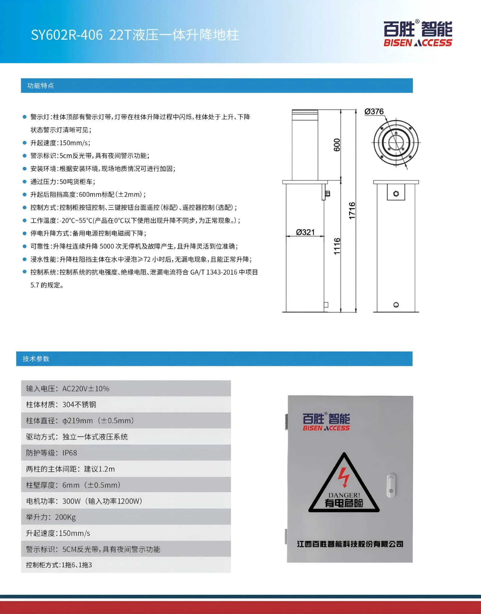 警示燈:柱體(tǐ)頂部有警示燈帶,燈帶在柱體升降過程中(zhōng)閃爍,柱體處於上升、下降狀態警示燈清晰可見;
